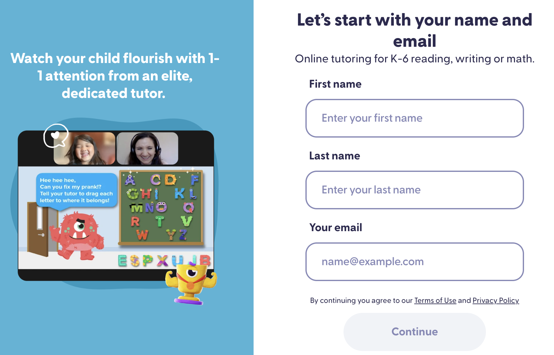 Seleccione el tema en el que busca ayuda: lectura o matemáticas. Elegirás uno para comenzar, ¡pero siempre podrás reservar clases adicionales para el otro! Luego, haga clic en "Continuar".