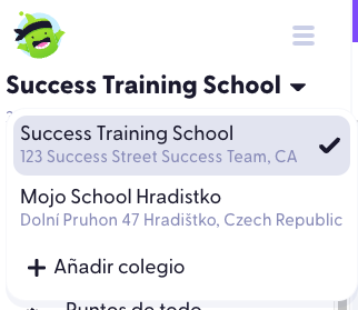- Cuando se haya aprobado tu solicitud para unirte al colegio y se haya verificado tu cuenta, podrás utilizar el icono del triángulo junto al nombre del colegio para ver los colegios a los que está conectada tu cuenta. Haz clic en los nombres de los colegios para cambiar fácilmente entre ellos con la misma cuenta.
