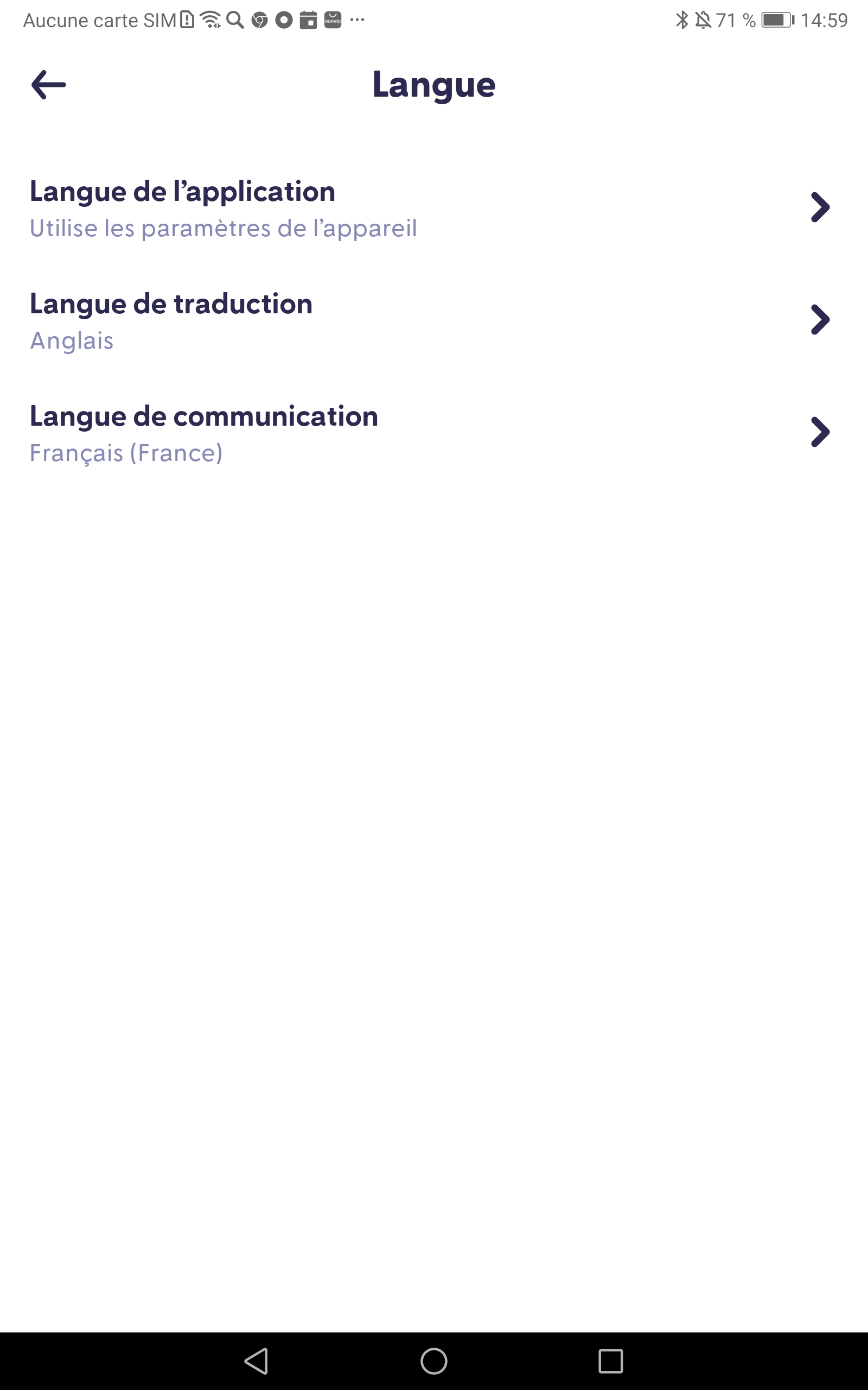 - Langue de l’application : définit la langue pour l’application Android, configurée dans les paramètres de votre téléphone.